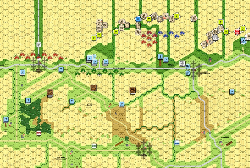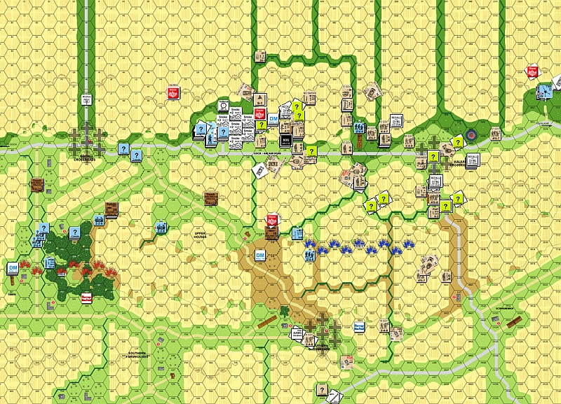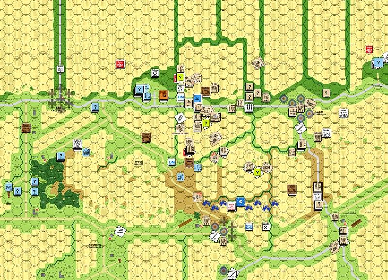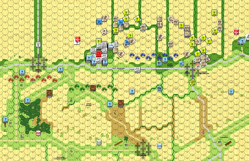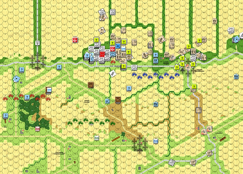 The Germans have managed to hold most of the Eastern sector of the battle ground, which includes some interesting terrain for a defence against the hammer blow that is sure to come. The defenders have also managed to save a whole Company of Paratroopers, though they have lost almost all their AT capability and an important HMG (HMG are not easily come by in this CG).