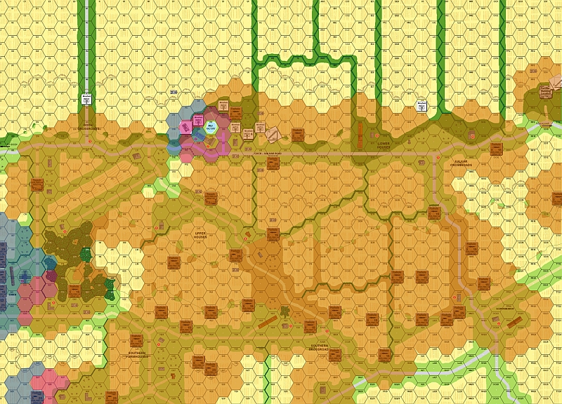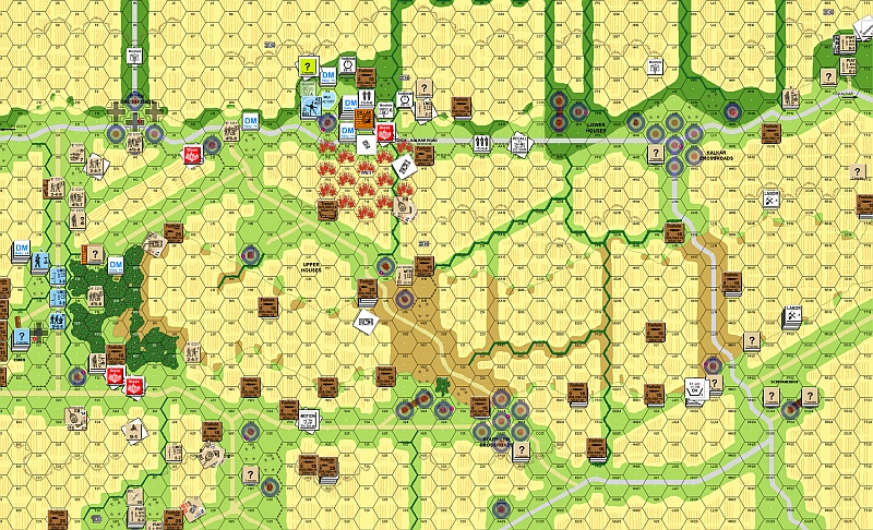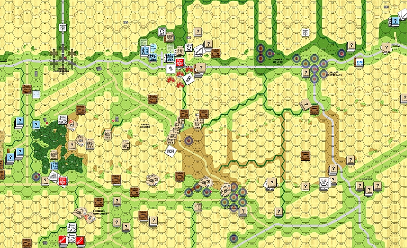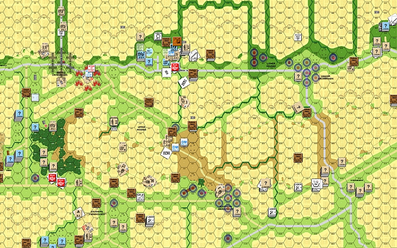 My pre-reg locations are U12 and U17 with the Field Phone in E14 (line running to edge of board and then off South edge) – he has to try and take the Milk Factory and these locations are the likely jump-off and support points.