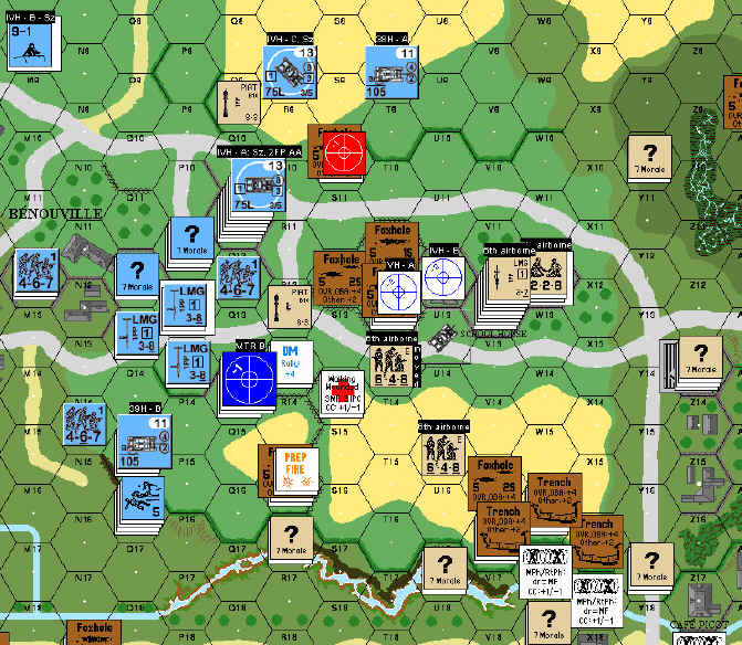 My Advances however have left him in control of just 5 of the Stone Building hexes in Benouville (P11/12/13, O12 and R13) and I have yet to claim the last remaining building in the valley (O16).