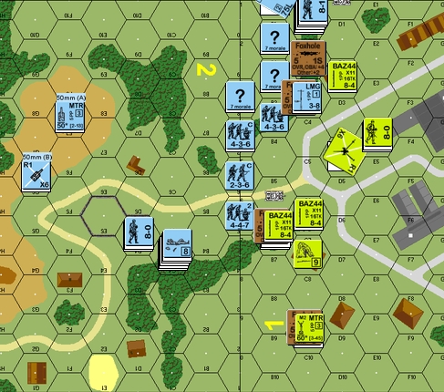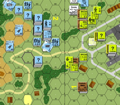 I open up at the tin-can with the Baz… and miss again! Arrggg… At least I am able to CR Break an MMG carrying 447 which might have saved the BAZ 747 in the 1C2 foxhole. My moves are mostly dummy AMs, though I also send another Baz 747 around to cover his central forces – this move might also encourage him to sneak some units down East into the LOS of my HIP MTR. His shooting is also atrocious which is a bit of a ‘get out of jail’ card for me. My Advances are to place concealed units in the tree line and thus I am hoping his MTR units do not repair! These Advances should give me chances to slow him right down, though he could still rush me with a fair chance of success
