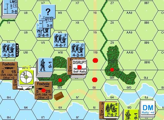 The US make their Prep shots, including using a just-rallied unit in the 7G10 woods… that was a surprise… I would have tried to get him off… as it turns out he scores a useful CR break against one of my LMG units on the Eastern side of the hedge. Actually Peter’s men get a lot of hits on my guys but all of a sudden they are passing MCs with ease… quite unusual in the context of this game. My first shot is a poor omen with and LMG breaking down immediately! He actually gets kind’a cute and moves one MMC away from the board edge to draw my fire, but I don’t worry too much about him… another guy (747) gets to the top of the elevated road but is immediately Pinned by leader directed HMG fire, a 337 that follows is also broken and saved from ELR only by his Fanatic bonus.
