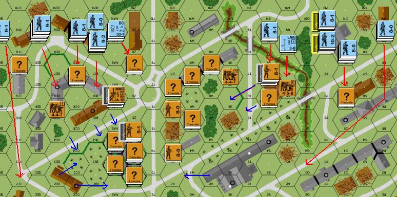 –       My HMG stack hammers the Commissar’s House and finally scores ROF and a decent hit, his 9-1 breaks (he has broken almost every time he has taken a MC) and that leaves him in even more trouble. Unfortunately a SAN result is called from this units shots and that Sniper eliminates my FT’s HS – the very next shot by this stack malfunctions the HMG! Another SAN comes down on a broken 8-1 and leaves him Wounded but the Prep Fire that led to this smashed 2x 447 so I am OK with that result. The rest of my shots are pretty poor, so I am unable to soften up the defenders much before attempting movement. Movement goes well however and I am able to drop DC into Z2 and AA3 – I am almost certainly going to be able to enter the Commissars House now. He loses his HMG through Breakdown, but since it was manned by Berserkers it was going to be unmanned anyway. I lost a few units to MCs in Defensive Fire, but more importantly of my 2x DC only one successfully hits it’s target, but in doing this I have an entry into the Fortified building.