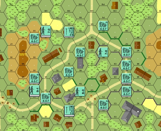 Again I have just 2 units facing down his line of advance, I run the risk of being swamped if he is willing to take risks though the Green Squads will be much hindered by their lack of MF. Once again I shall use the units I have left back to dig foxholes with which I can form a stronger defence than the terrain otherwise allows. I am making the Stone building here the centre-piece of my final defence.