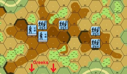 Here my plan is to use the LMG 548 with -1 leaders to interdict the approaching Greeks as they attempt to climb the hills. Attacking cover is slight and his ELR of 3 and 7ML will make him vulnerable to good breaks. I shall probably focus on the leaders and stacks (obviously) but if easy shots are available I will take them too. My other units will (if time is permitting) dig foxholes on the rearward slope of the Mountain to protect my men against the close-in fighting which is sure to come!