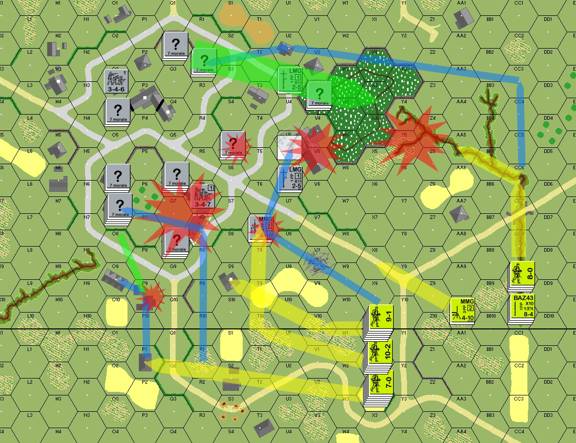 – My 2x MMG 667, 9-1 (12V10) are able to fire for effect on his forward MMG, and indeed on some of the Village as well.
