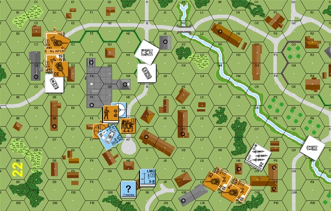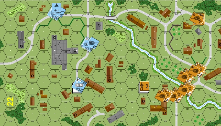 As always with Eastern Front armour battles, the Germans MUST keep the Russians in a killing zone of 6+ hexes away… this in and of itself can be enough to negate the usual numerical advantage. Since victory can be achieved by the Russian either killing all the German AFV (the most common Victory for the Soviets) or by getting 18VP off of the Western edge of the map the Germans are forced to cover the whole of the map’s width in a congested village.