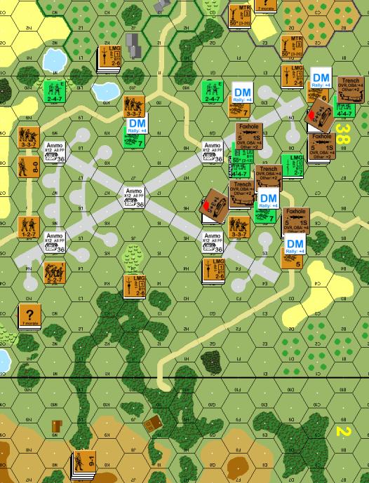 I get a bit of luck when my first attack breaks his 447 in the essential J8 building! Then my MMGs go on a bit of a tear, but they achieve nothing – he is passing most of the MCs with ease. I decide to try and take this game by the scruff of the neck and start sending forces out to capture the last building and the necessary number of Ammo Supply crates. I lose a number of units this turn, but in the process JP wastes a lot of shots as his dice finally remember that they are allowed to roll high once in a while! I have made a run for the least accessible Ammo first (38G8) with the intention of at least leaving a broken unit in his lines to stop Subsequent First Fire opportunities, but the units I send out get KIA when they finally fall. All of a sudden the dust settles and I have managed to somehow pass through the carnage with 2 units adjacent to each of 3 of the 5 Ammo Boxes (G5, M5, M8) – I need 2 units because capturing the Boxes uses the Recovery mechanic and there is a chance I might roll ‘6’ in Rally. I do not put men ON the Box hexes because I can enter in the Advance Phase without suffering the massive First Fire penalties (-3) for moving in the open across a runway. JP revealed his final HIP positions (2x HS in 38 M10 & G10) but the damage they cause to my men is minimal. In the end I have suffered a LOT of losses, but I have also managed to be one step away from fulfilling my victory conditions; I have control of 2 buildings and I should be able to control 3 Ammo Crates in the next Rally Phase. JP lost a LMG this turn to malfunction, but also continued his unsettling run of low FP attacks scoring lethal results.