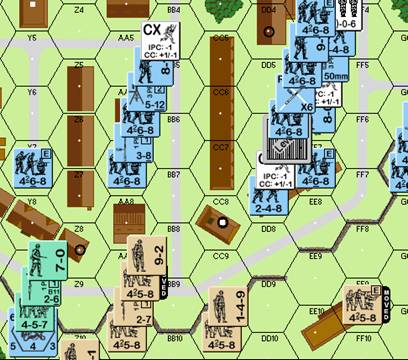The EE7 squad died from his last squad and –2 leader in AA10 as it tried to cross the road and so I only had the 3 squads and leader in DD7 left to do anything with. They moved as a group and went into DD8 where the leader was pinned from the fire lane but the 3 squads survived, however, they were intending on moving into EE10 to try and break the FF9 458 and advance off the board but the loss of the leader denied them the movement points so I went CX and moved into EE9 where one broke and then to DD9 with the intention of breaking the CC10 squad, advancing into CC with the hero and rolling a snake eyes so we could withdraw from CC and leave the board. (A desperate grab at straws…)