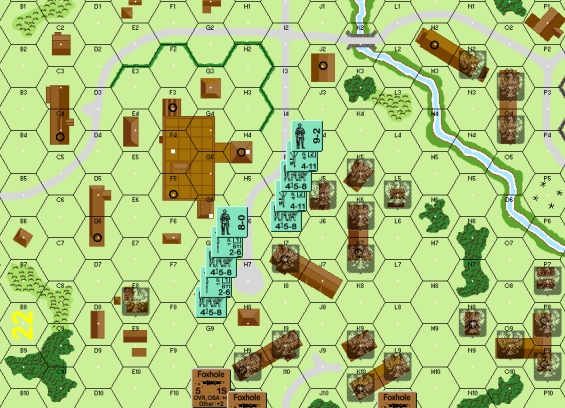I attempt to take more territory and also to get in close enough to help out with the Melee in 22B9, but the moving 457 is ELR broken and this presents me with all sort of difficulties. He was in trouble anyway but now being broken like this I run the real risk of having JP make it in to the village through the extreme South side as I have no-one here left to cover the approaches, I hope JP doesn’t take the time to do the maths with the Controlled buildings. To counter my fears I send my Green unit across the stream and into the Orchard hex (22P5) where he might be able to take some of the buildings North of the stream if I am able to break the HS here (I cannot: my shots are atrocious and 8FP +2 shots don’t cause so much as a single PTC on this guy by games end). I skulk with everyone I can.