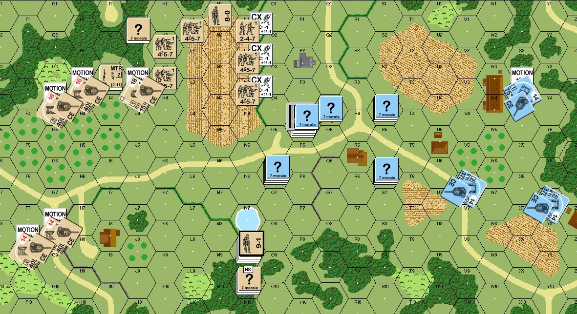This is a setup which might cause some problems for the Germans. Essentially the only units they have to stop me making major gains early in the Scenario is the O6 stack. I have the chance to swarm past this unit and make for the N1-N4 Hedge. He has also failed to place strong contingencies for my moving to the rear of his men through the Woods; only the S4 and S6 stacks have the ability to counteract me without severely weakening his front line, and that might not be enough to stop me hitting his O6 unit from both front and behind.