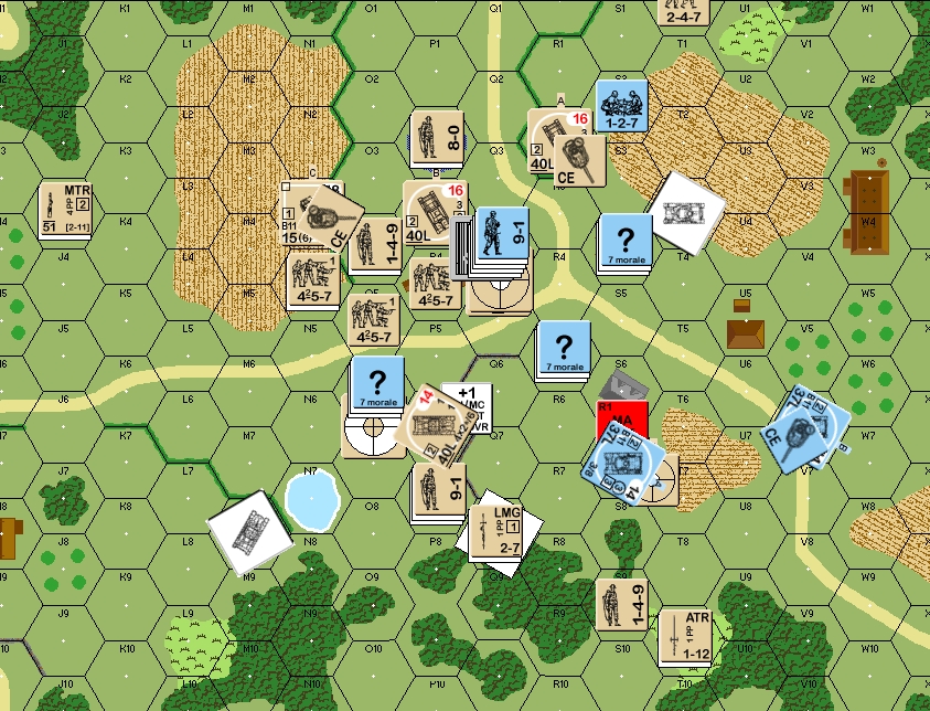 He still holds his fire and I am able to claim a building (P2) before he finally shoots at anything (breaking a 457 with a 468 from P4(1)). My AFV have come forward to both sets of hedges and he is rapidly becoming surrounded. His AT Gun breaks cover (Q8) to blast away at one of my A9 and completely gaks the first attempt to hit him but then succeeds with a secondary ROF shot and eliminates my AFV. I strip the Concealment from the AT Gun with a lucky 1,1 thanks to my 9-1 leader but fail to break the crew. I have taken 1 building and am starting to sidestep the village… even more worrisome for the Germans is my numerical superiority and the close-in nature of the fight, this could become a white-wash quickly if he doesn’t discover a well-spring of luck soon!