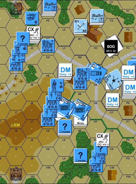 Unfortunately the Disrupted Conscript rallies which means the ATR he has with his is also back in the game, he also repairs the MMG! Luckily though, instead of standing and holding me back some more JP decides to run for the village… he essentially sets up a hedgehog bordered by the P3-N4-N6-P7 road, though he has the MMG with the 9-2 and a broken 8-1 in M7. As he runs to set this up I shoot at a 7-0 moving in the open, but my MTR malfunctions with its first shot; the 7-0 was heading for N2 but in getting there he is broken, leaving his with 2x HS and a 7-0 broken in this building as well as a LMG 468. JP also has a 2x ? stack in K1 and L9 but they have to be dummies as he still has 4x ? left and these are the only stacks as yet un-exposed.