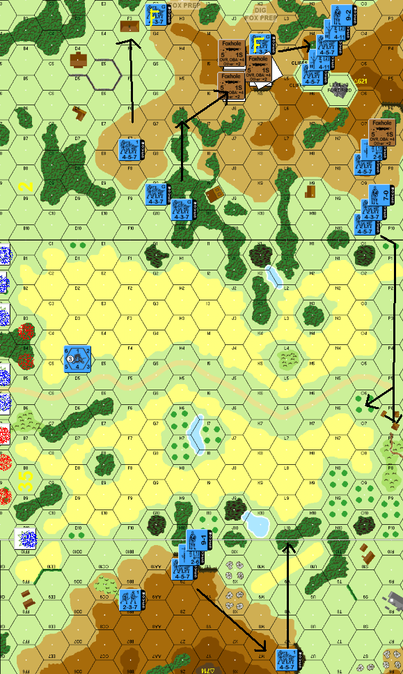 His first squad entered at 35A10 and got stripped by my guys on the board 15 hill top, a 2nd squad survived the RF but the third striped too. Sadly a pair of 1st line squads, a 9-0 leader and a MMG toting crew snuck through from 35A8 where I did not have LOS or, to be precise, I was saving my MMG’s for a MTR squad which paid off as the next guy to enter was 4-4-7 carrying a Mortar and he promptly died from a 2FP-4 shot with my MMG retaining ROF which is vital in this 1st turn. Another 4-4-7 entered and tried to pick up the dropped Mortar but was CR’ed and pinned by the same MMG – this time losing ROF so I left a 1FP residual to deter any more attempts. A 4-4-7 got fired at and missed by my 60mm mortar – that’s 2 of my long range weapons used but a squad in 2F7 fired at long range and scored a 1MC which it obligingly failed for a stripping, the unit continued to move and I fired my LMG in 2O8 at long range but it broke down (the 1st of 3 breakdowns for the game and it never repaired or malfed out…) Another 4-4-7 went CX to charge down the road and it was CR’ed by my 2nd MMG. A 2nd line squad entered at 35A2 and my 81 mm MTR fired but the shell was a dud, however I had rof and an acquired, that squad was later striped by some long range infantry firepower. Another 2nd line squad entered at my 81mm MTR’s acquired hex and I fired again but rolled boxcars which took the mortar out of the game, this is a serious loss, I would rather lose a MMG. (Curses I wanted it’s smoke capability…) Another 2nd line squad got stripped as it entered at 35A1. the rest of his units entered safely and by turns end he had 3 distinct attacks coming; 1 towards hill 621 (9 squads and an 8-0 as well as his DC) another down the centre of the board to secure the road (6 squads, the 2 crews and all his SW along with a 10-0 and a 9-0) and a 3rd attacking hill 714 (3 squads).